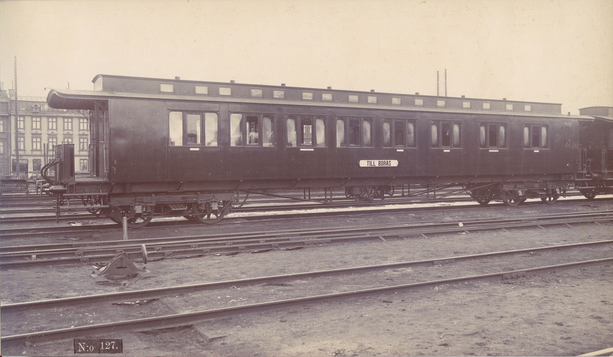 Tågvagn. 2:a och 3:e klass boggiepersonvagn. Ur album för Vagnfabriks Aktiebolaget i Södertälge.