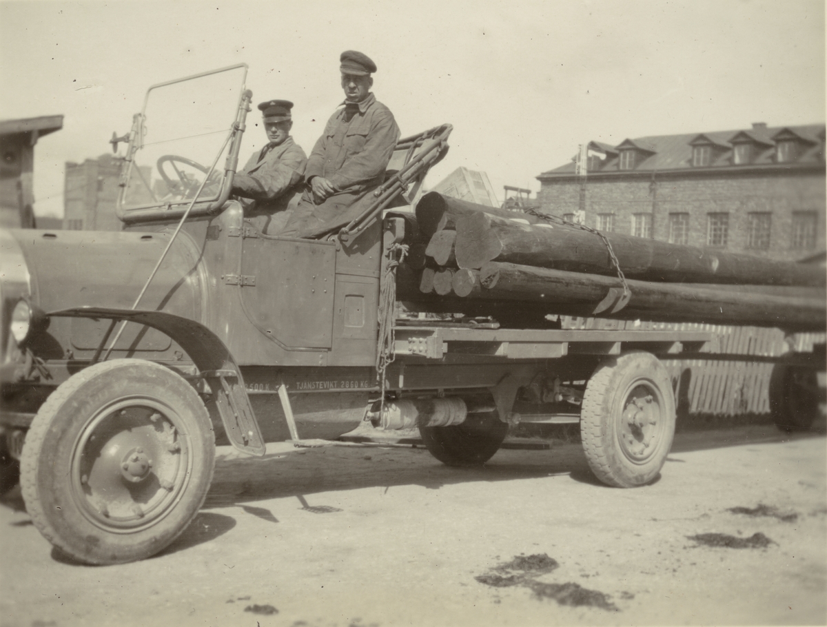 Hjälmsätrakabeln. Stolptransport med släpvagn. Ur albumet Kabelarbetet Hjälmsälra (Hjälmsättra) - Norrtälje - Finnviken utfört under sommaren 1928.