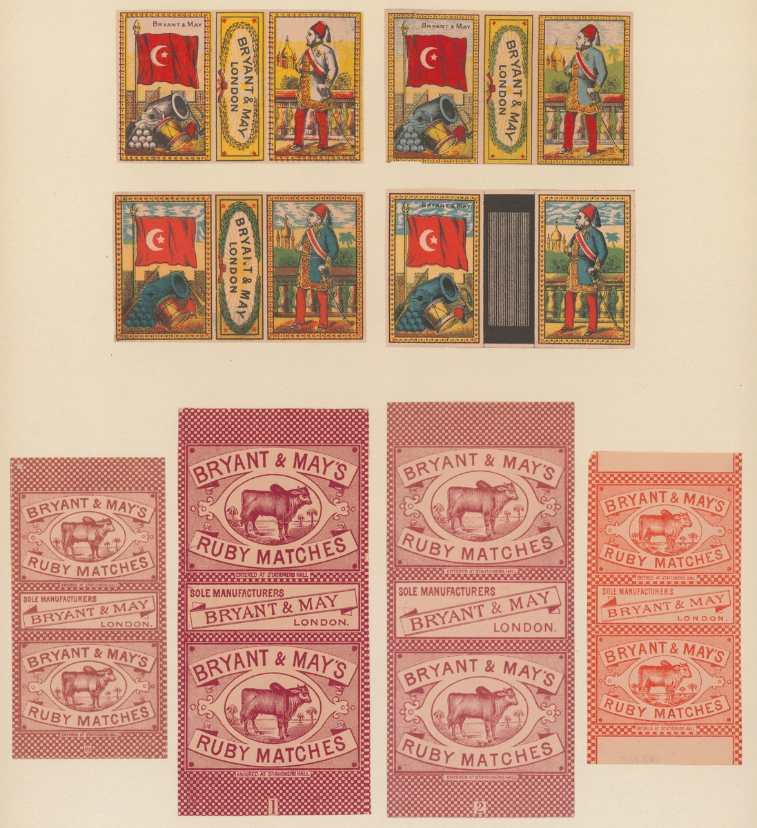 Etiketter för tändsticksaskar, från Svenskt Industri- och Handelsmuseum.