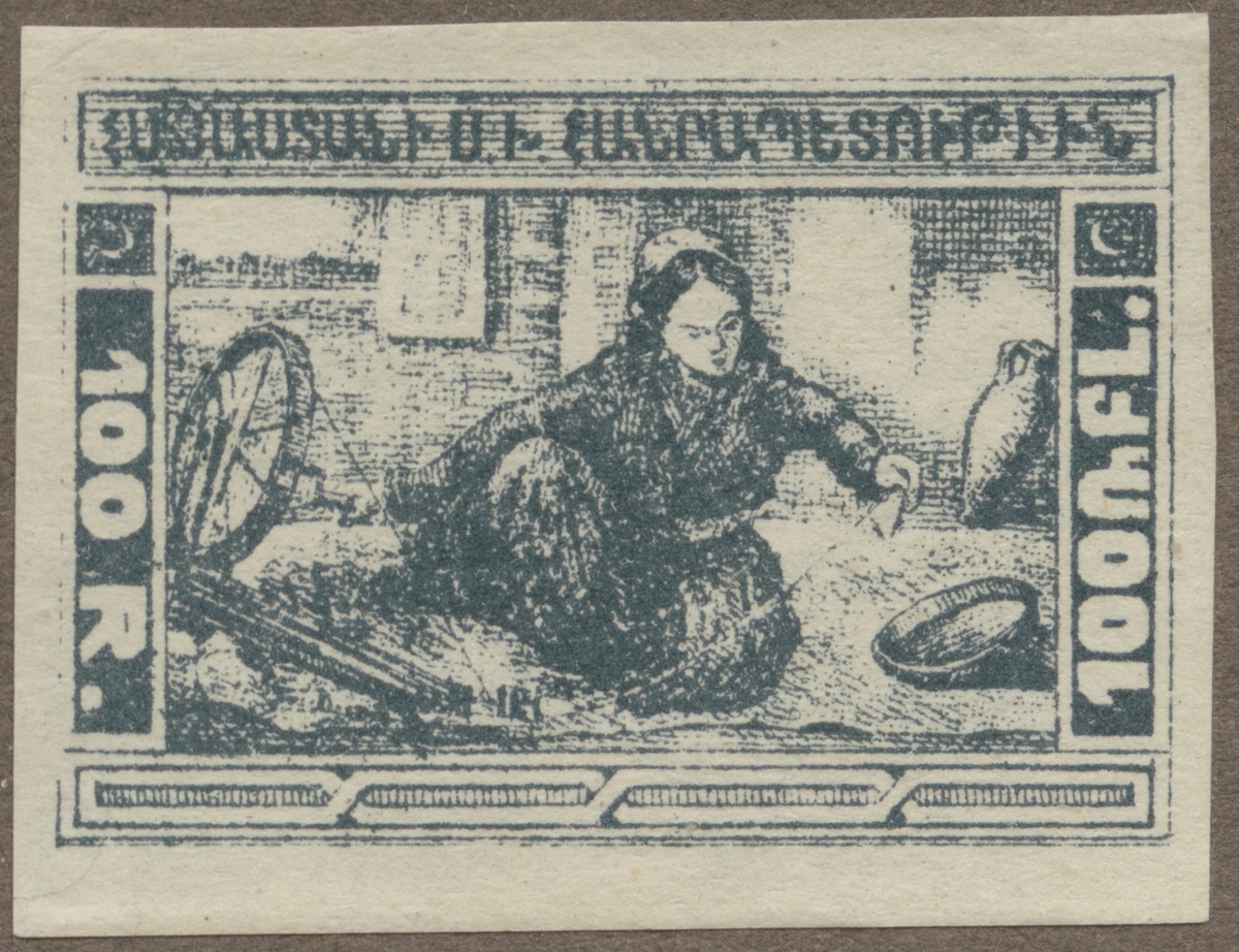 Frimärke från Armenien, 1922. Motiv av textilarbetare. Kvinna med gammaldags spinnrock.