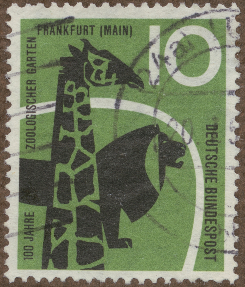 Frimärke från Väst Tyskland, 1958. Motiv av Lejon och Giraff 200-årsminne Frankfurt am Mainz 200-årsminne