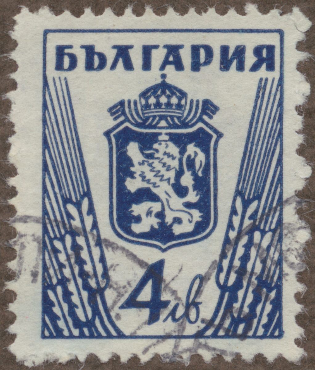 Frimärke från Bulgarien, 1945. Motiv av Rågax inramande Bulgariens vapen