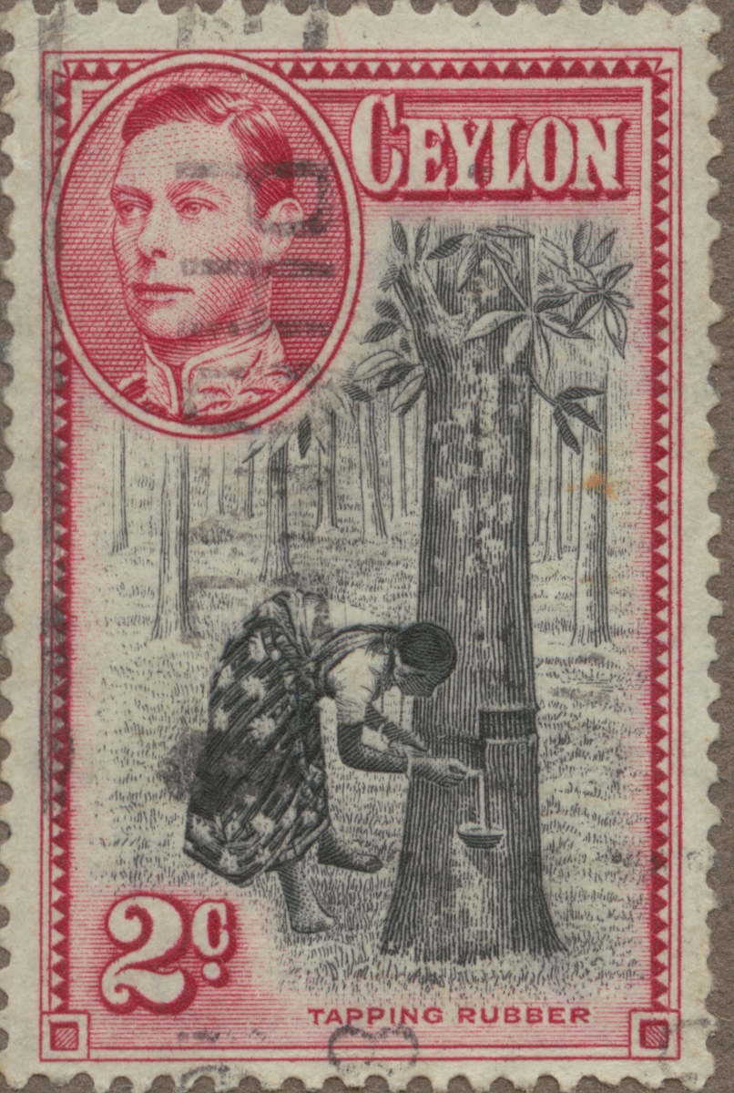 Frimärke från Ceylon, 1953. Motiv av gummitappning på Ceylon. Överst: Kung George VI.
