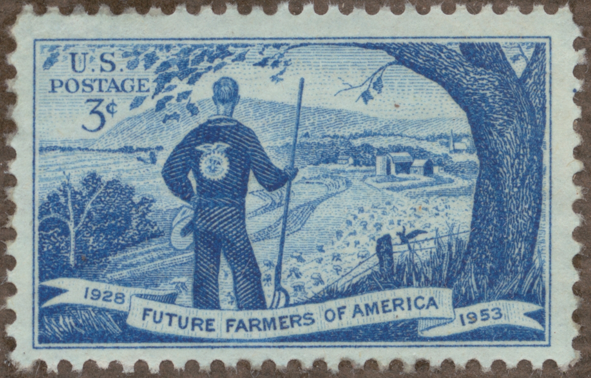 Frimärke från U.S.A., 1953. Motiv av Framtidens farmare i U.S.A. Föreningen 25-årsjubilerar 1928-1953
