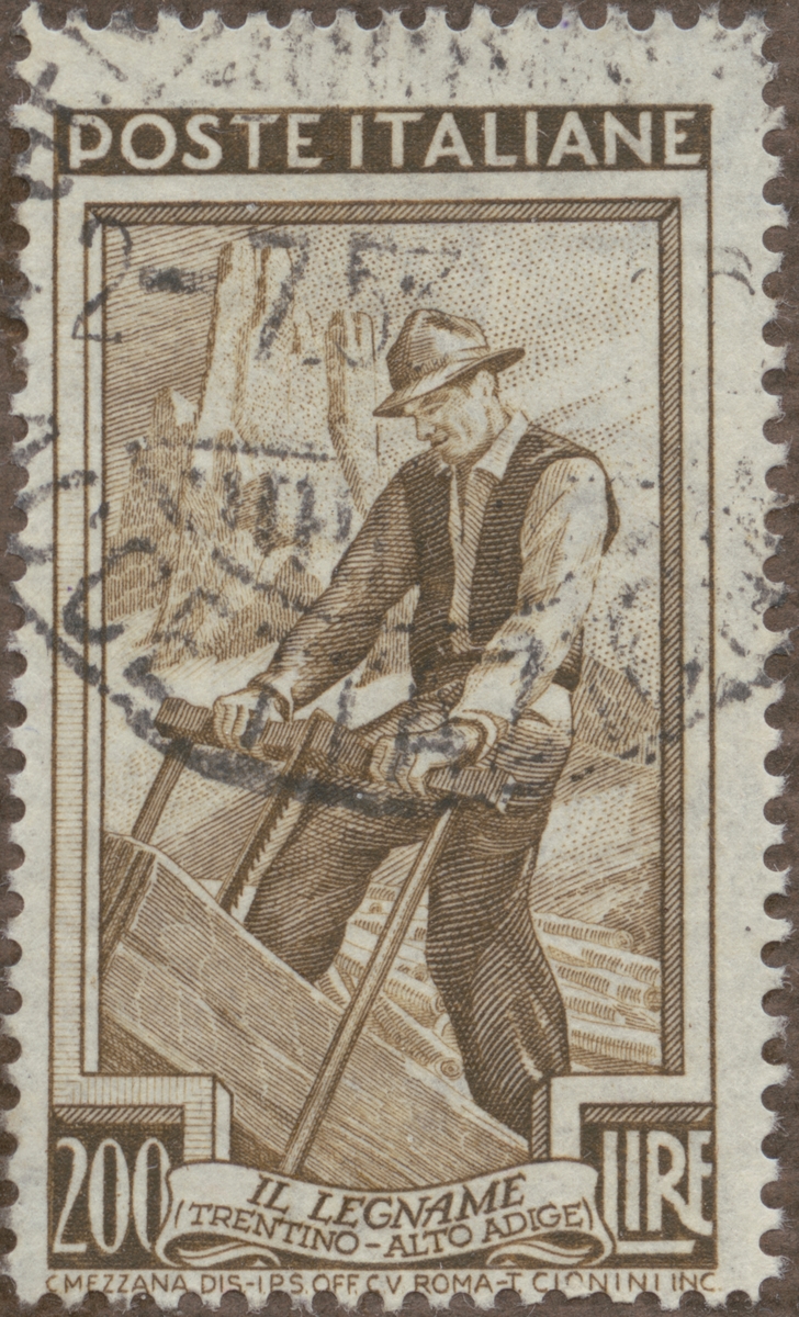 Frimärke från Italien, 1950. Motiv av Italiensk timmerarbetare från Trentino - Alto Adige.