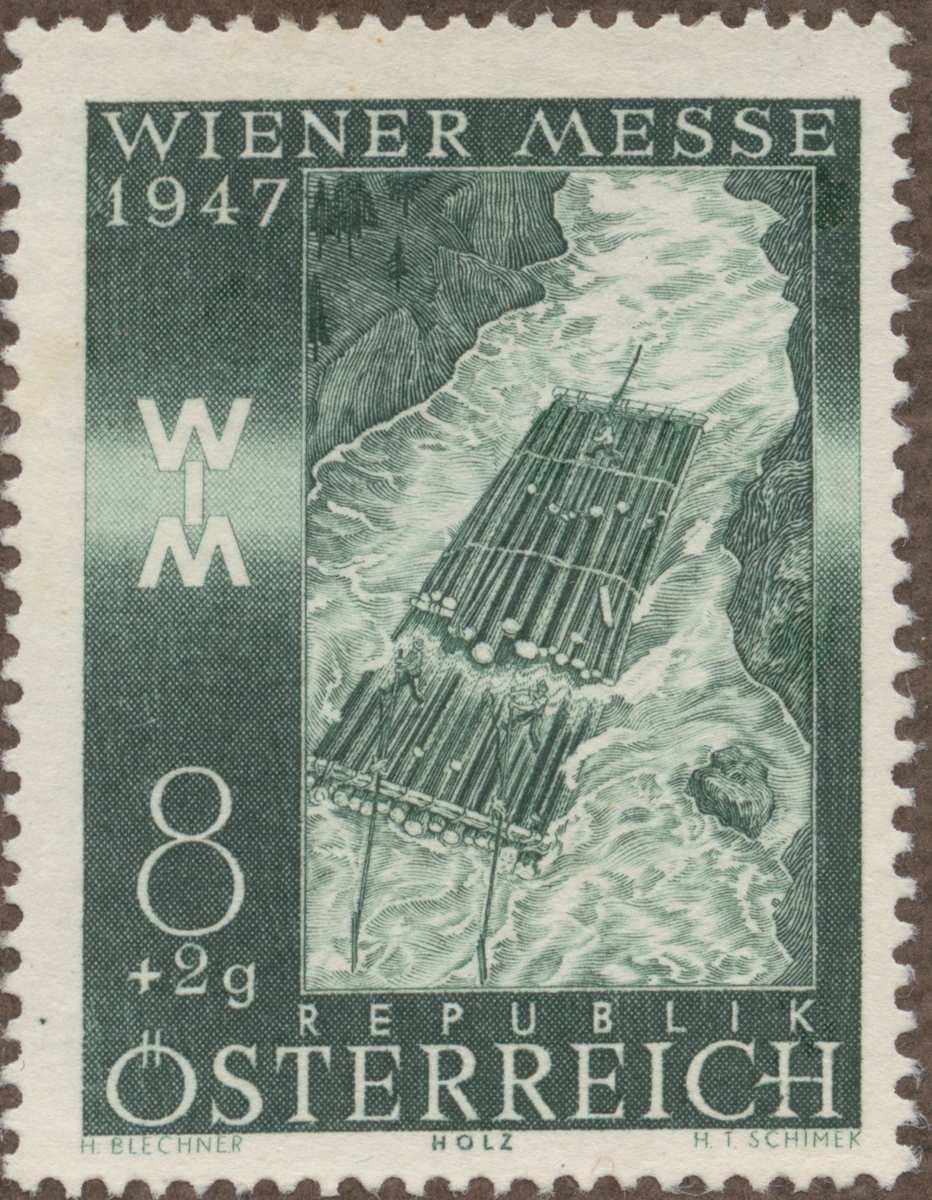 Frimärke från Österrike, 1947. Motiv av timmerflottning på Slazach. "Propaganda för Wienermässan 1947".