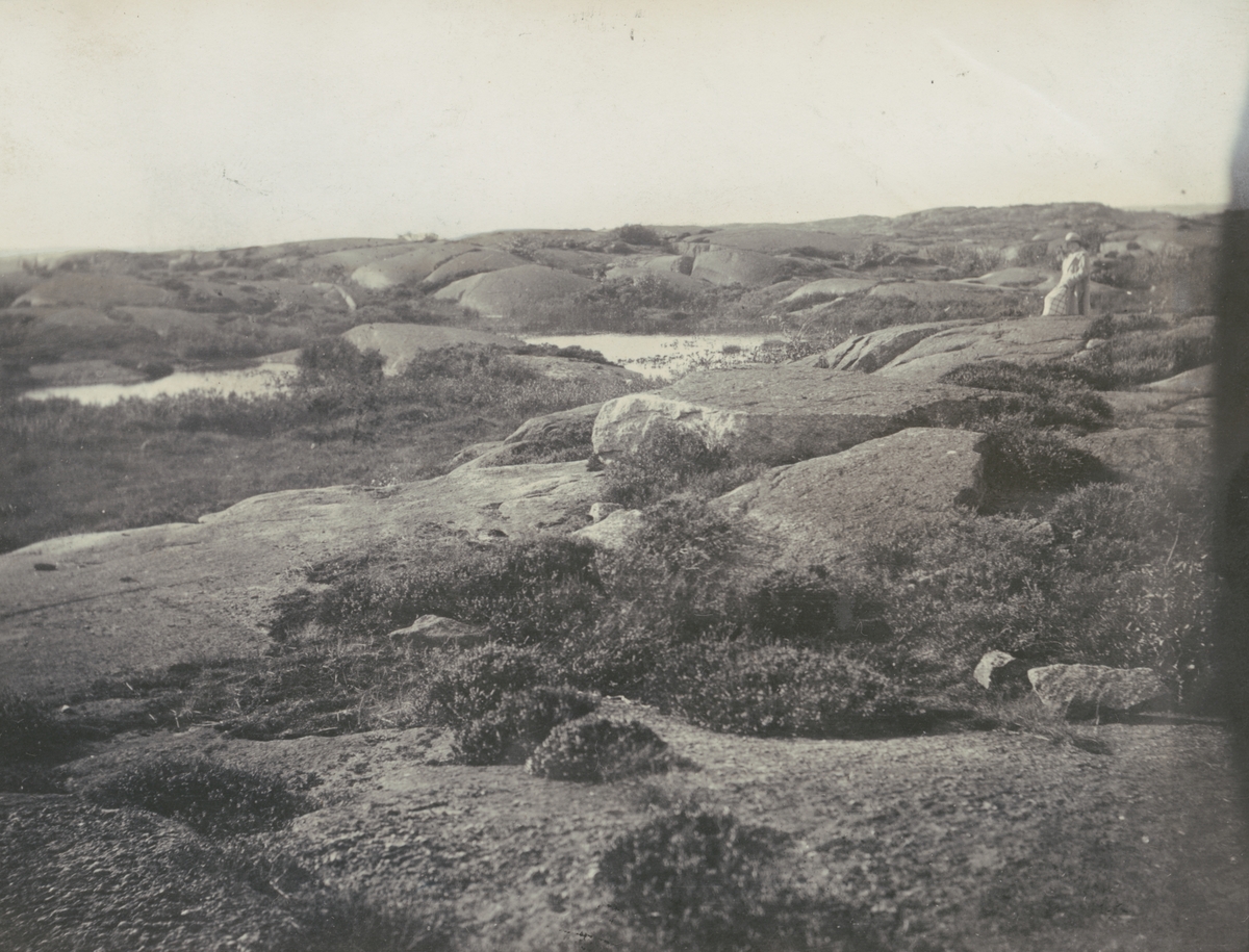 Diverse bilder från Fred Goldbergs samling. Motiv av kvinna som sitter bland klippor i Flatås.