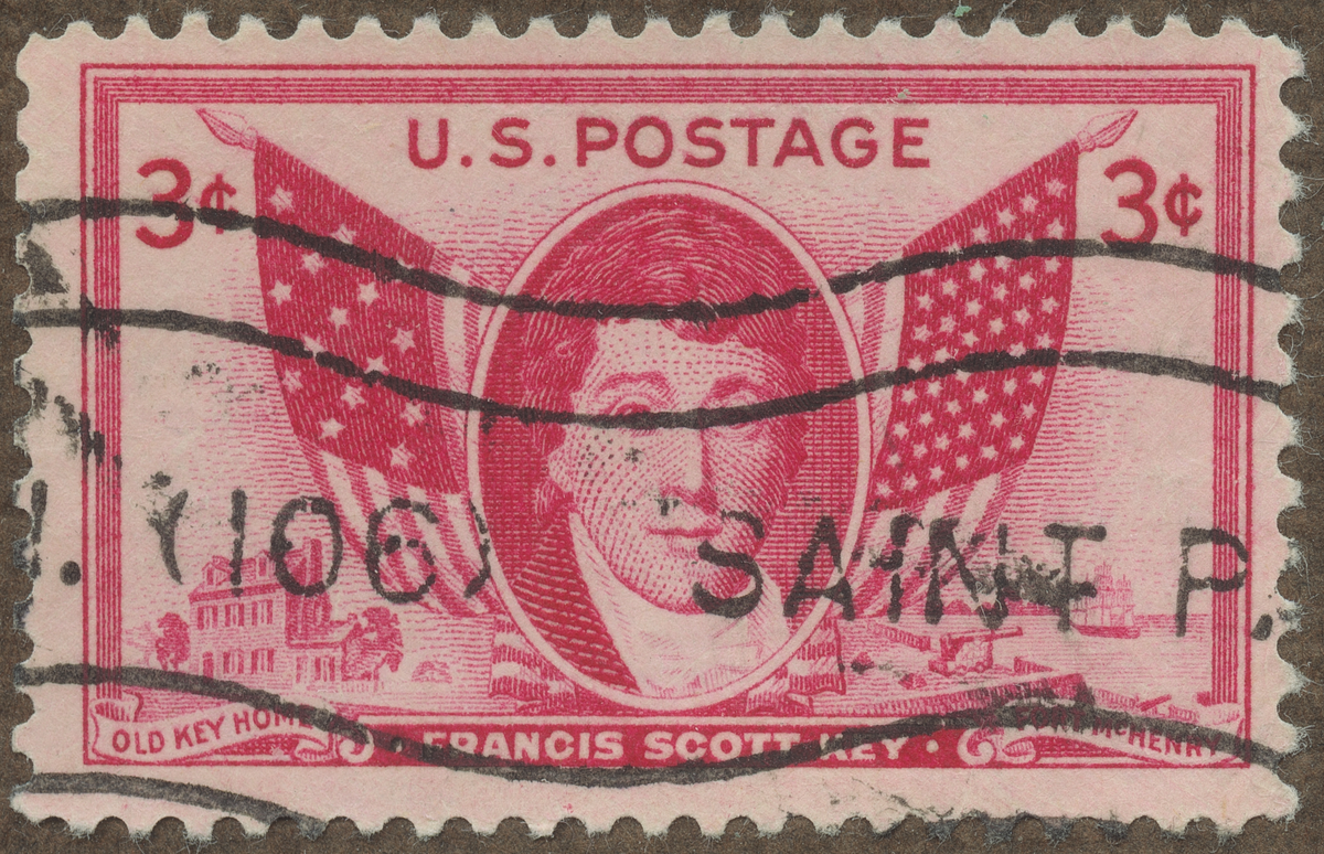 Frimärke från U.S.A., 1948. Motiv av Francis Scott Key: 1780-1843. Diktare av nationalsången: The Star-spangled Banner": 1814. (t.v.) USA:s flagg i 1814 med 15 stjärnor och (t.h) USA:s flagg i 1940 med 48 stjärnor