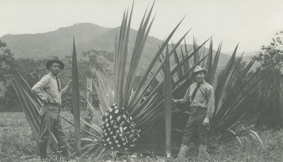 Fotografi från expedition till Peru 1920. Motiv av två expeditionsdeltagare som poserar vid stor suckulent.
