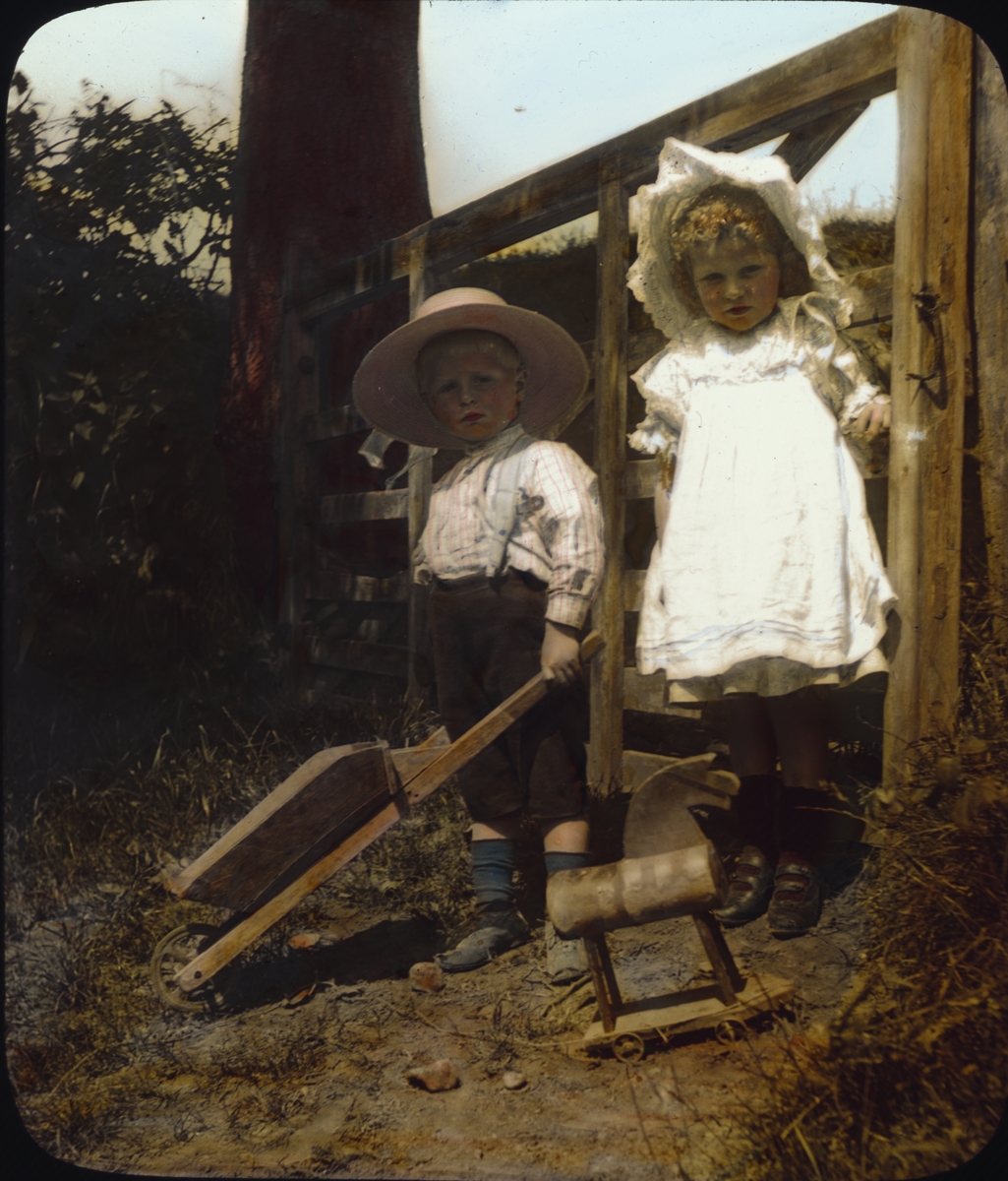 Kolorerad skioptikonbild med motiv av lekande barn. Flicka och pojke.
