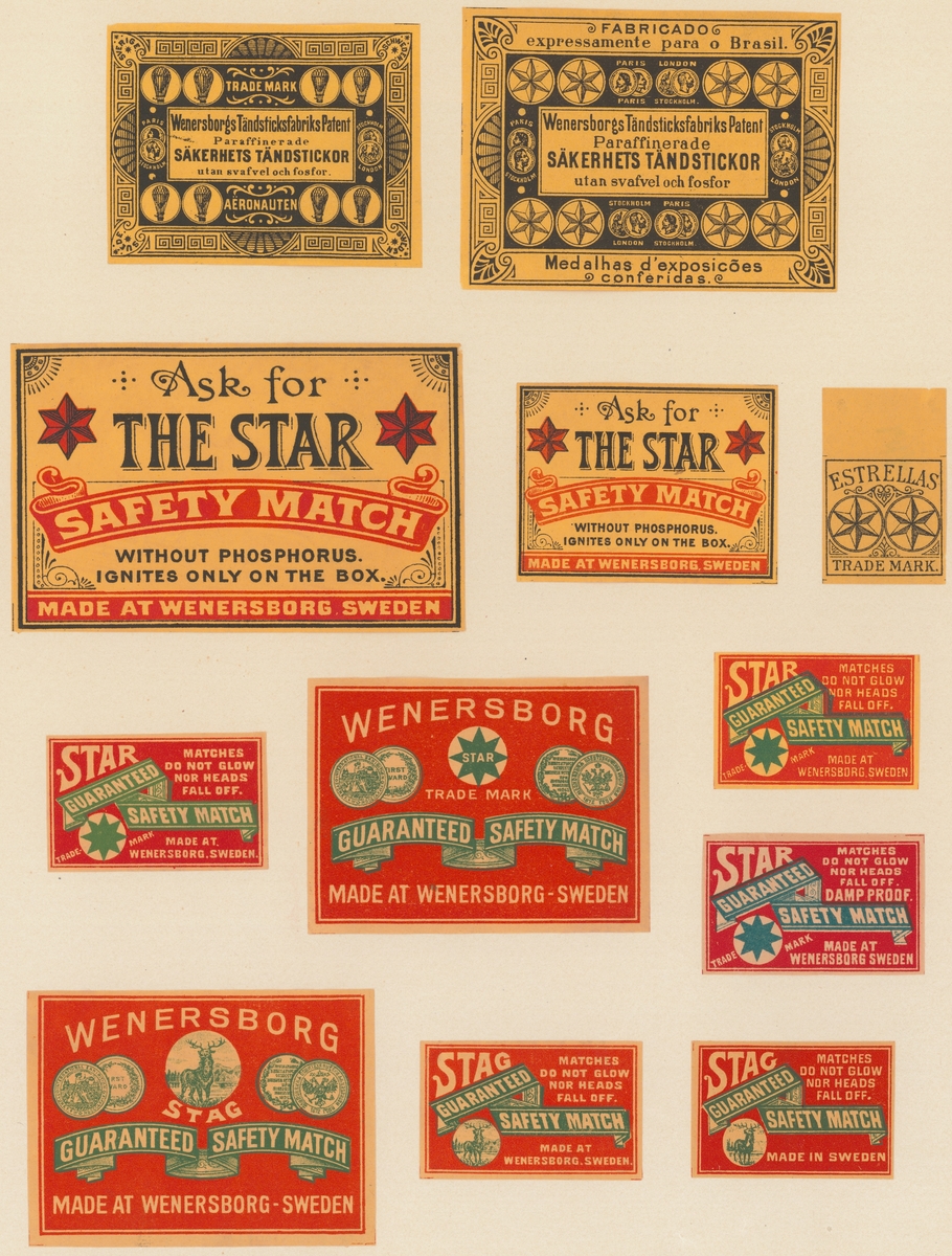 Etiketter för tändsticksaskar, från Svenskt Industri- och Handelsmuseum.