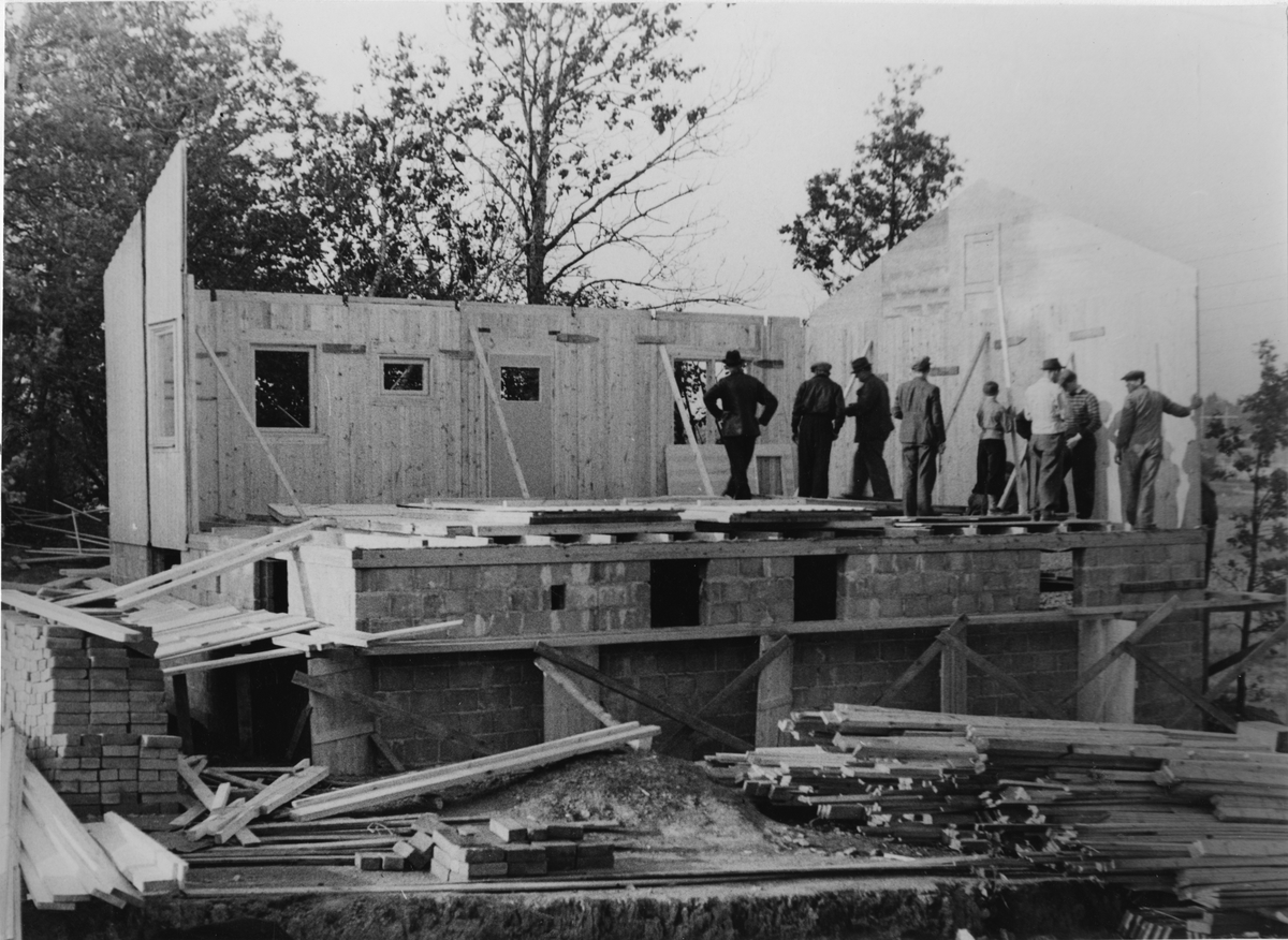 Monteringsfärdigt trähus under uppbyggnad.