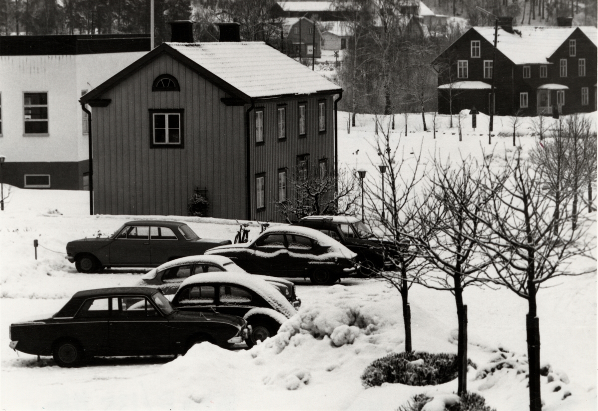 Bruzaholms Viror AB, före detta AB Maskinduksverken. Öster kontor. Bilden märkt "Bakgrund. Ladugårds gärde, vänster. Höger nedbrunnen. Restaurerat 1700-tals hus".