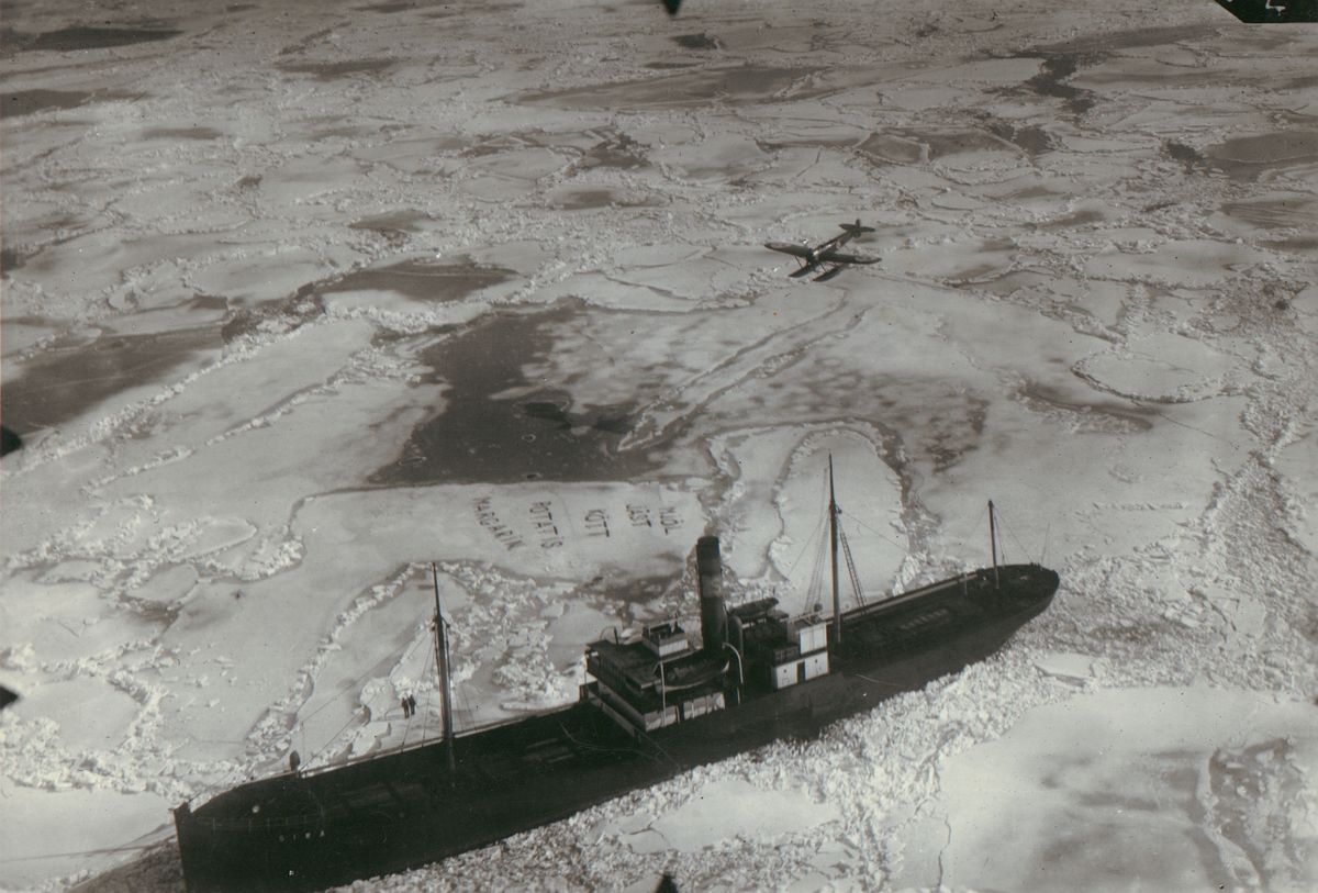 En i Öresund vintern 1929 infrusen ångare "Siva" har på isen målat vad de önskar i proviantväg.