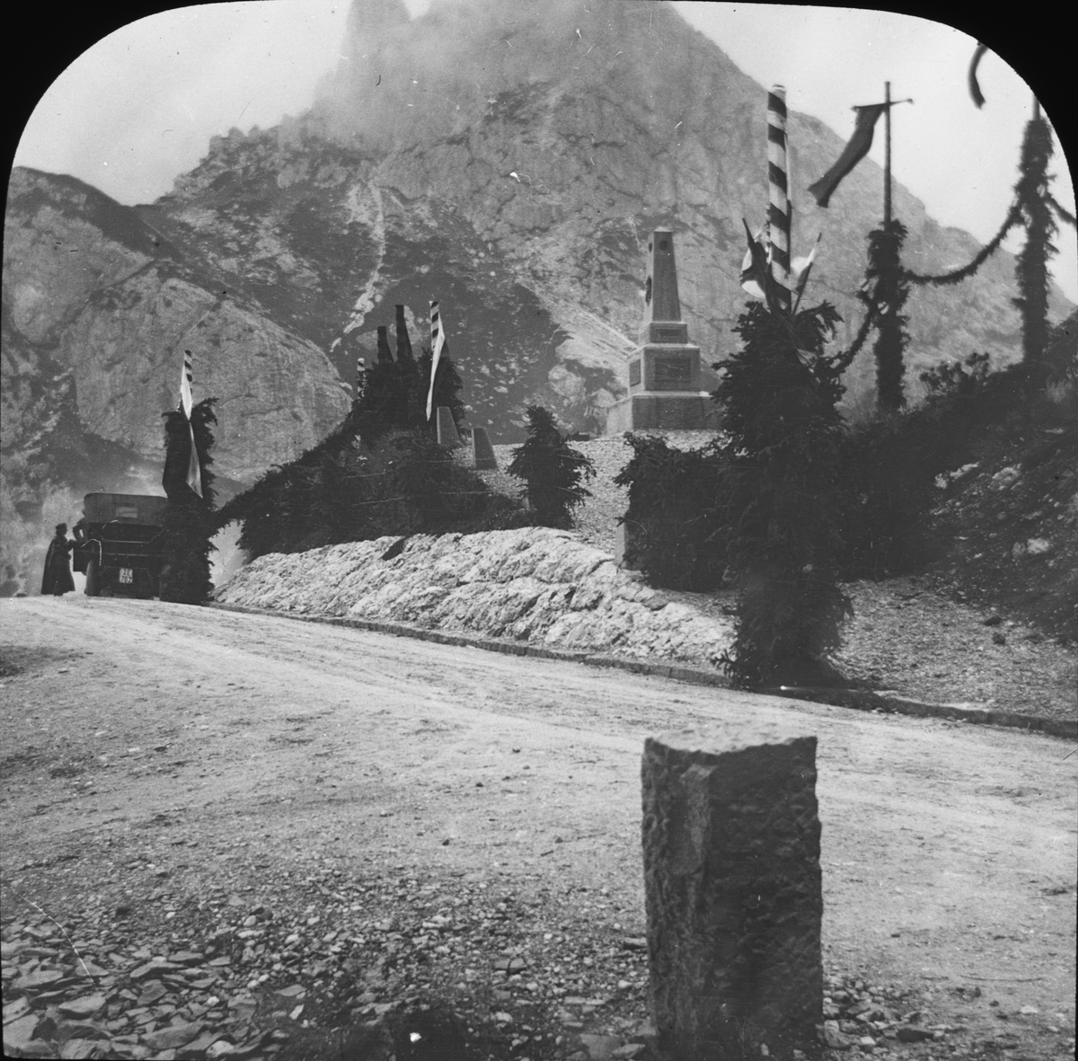 Skioptikonbild med motiv från bergspasset Falzarego, Italien.