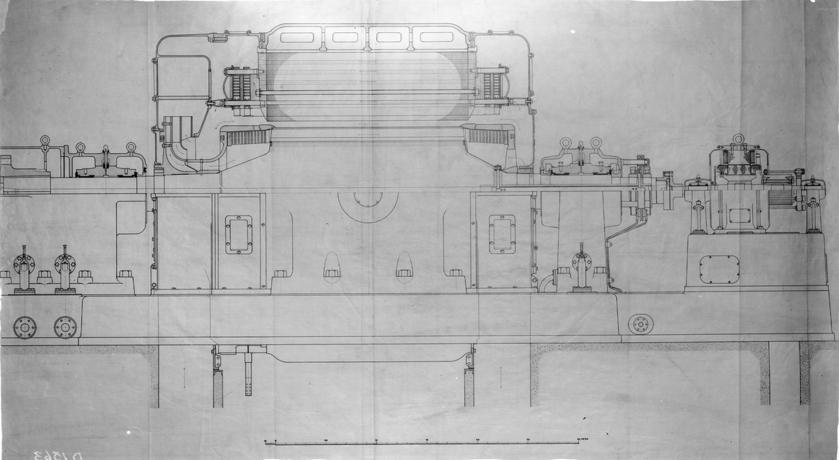 Konstruktionsritning på snitt av generatorn, Värtan.