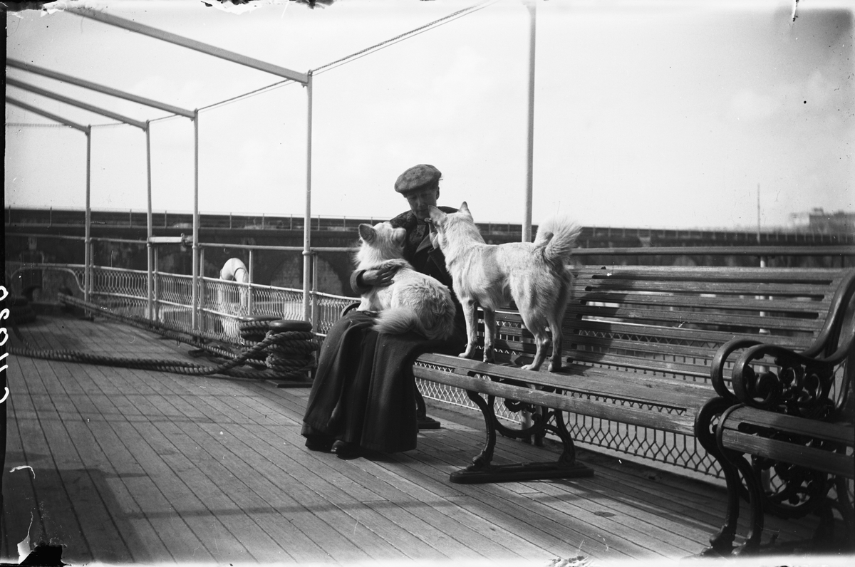 Drottning Victorias bilder. Kvinna sittande på båt med två hundar.
