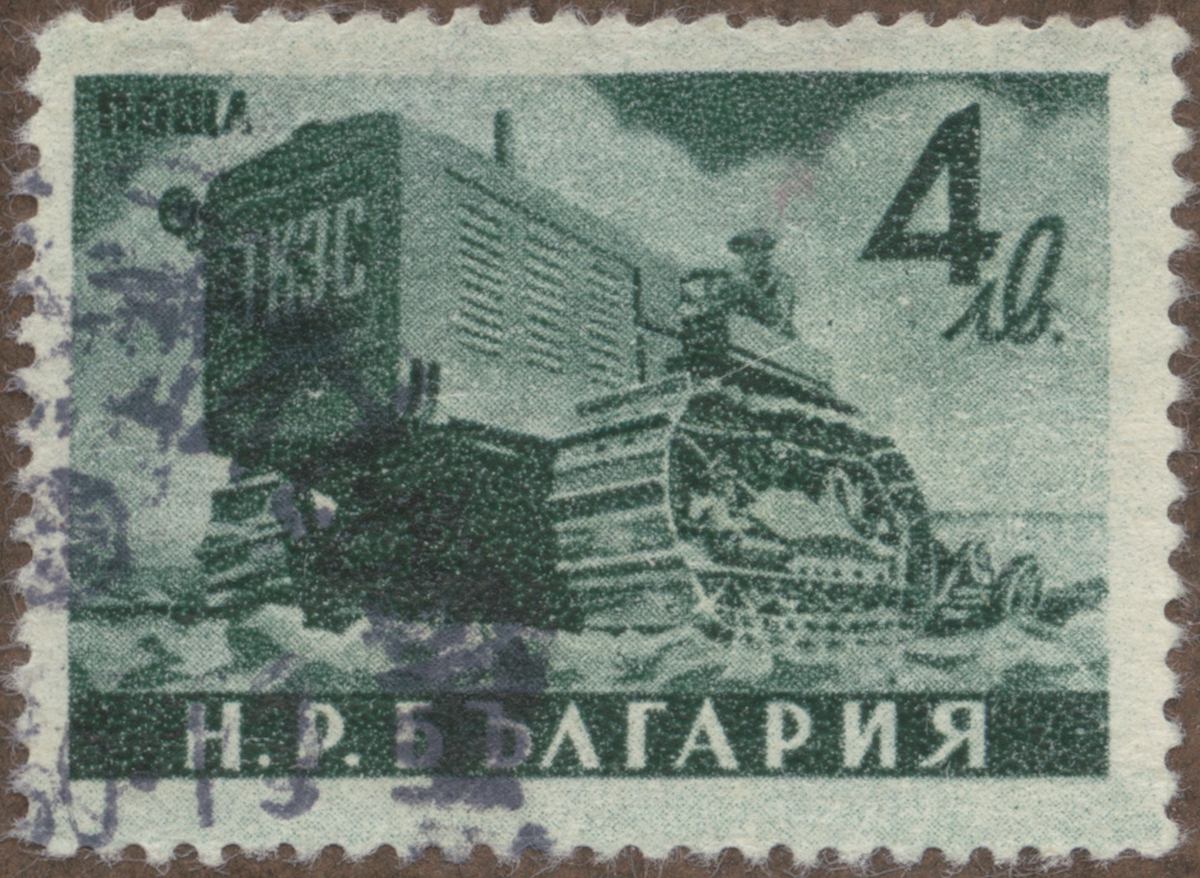 Frimärke från Bulgarien, 1950. Motiv av Traktordriven Skördeapparat