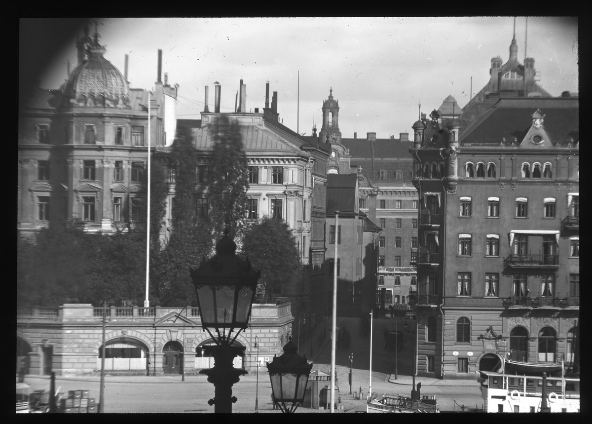 Två bilder tagna från samma punkt (från Slottsbacken mot södra Blasieholmen, Stockholm). Denna bild är tagen med teleobjektiv (lång brännvidd). Jämför SKC6358.