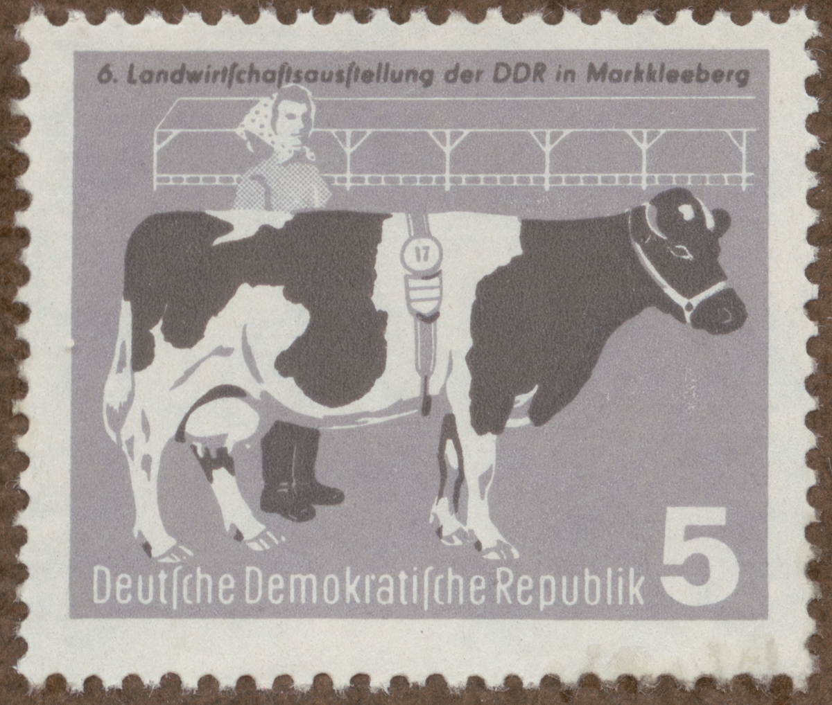 Frimärke från Öst Tyskland, 1958. Motiv av Ko av svartvit ras D.D.R.-s 6:te lantbruksutställning i Markkleeberg