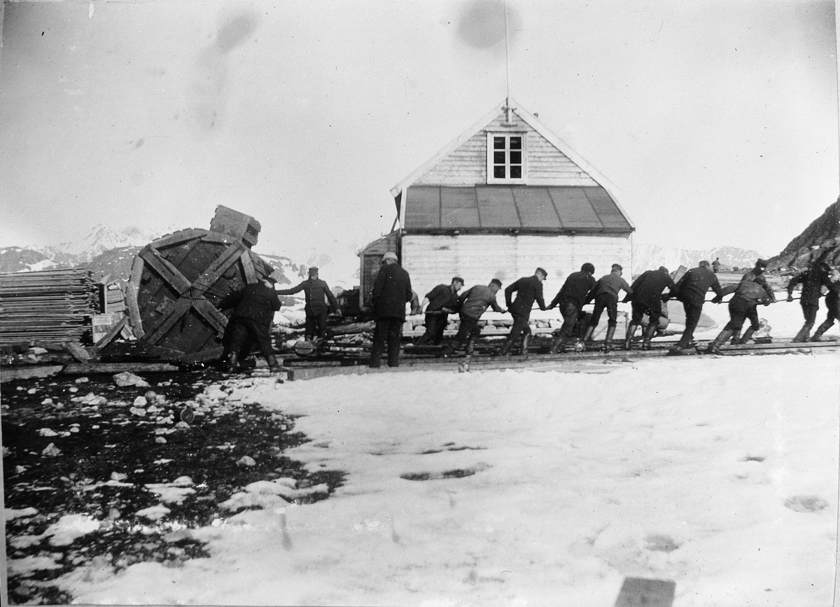 Gasverket till S.A. Andrées ballong föres i land på Spetsbergen. Pikes hus i bakgrunden. Originalet tillhör Ingenjör James Sandberg, Stockholm.