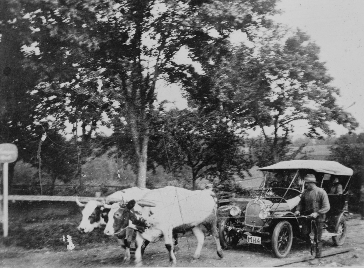 Scania "Perry", 1916. Ekipag som kört fast i Smålandsgyttja. Men bättre brödlös än rådlös. Två dragare upplånades och sedan de gjort sitt kunde den avbrutna färden fortsätta.