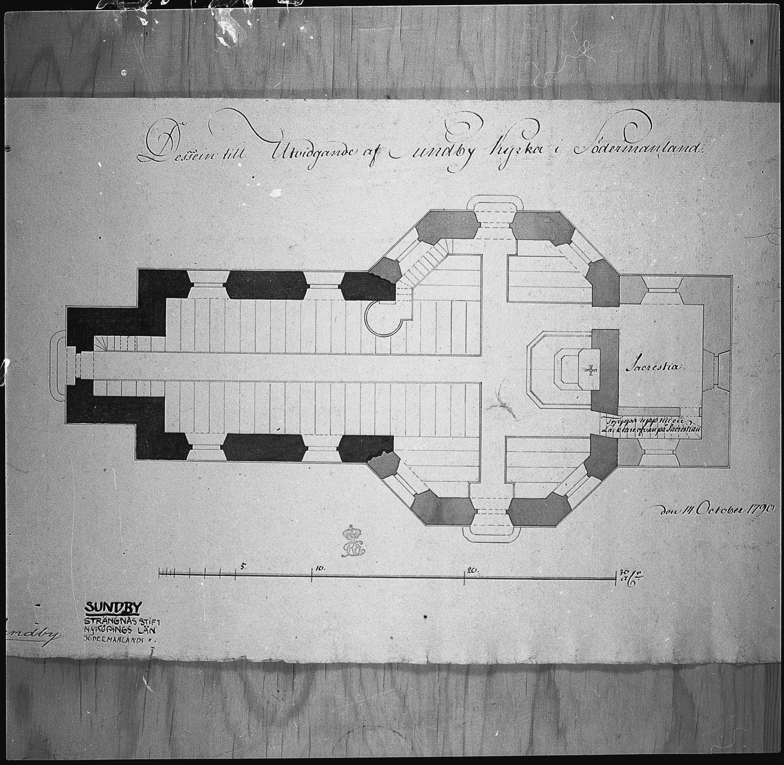 Foto av planritning av kyrkan. Ritning i Kungl. Byggnadsstyrelsens arkiv.