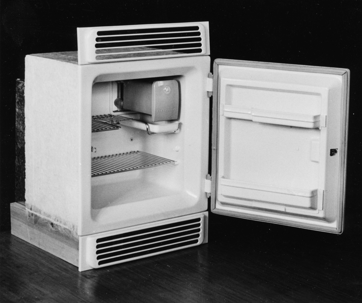 Kylskåp, öppet. Plastskåp.