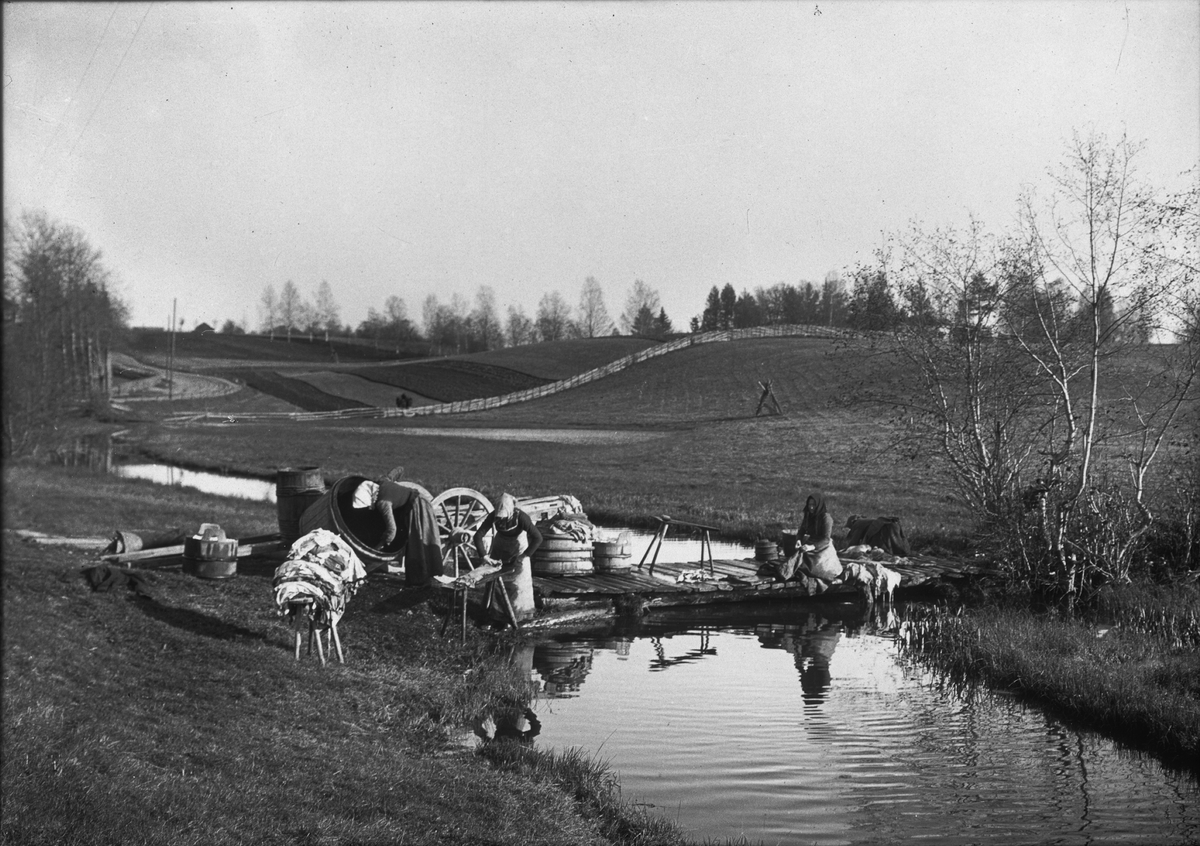 Diapositiv, fönster-bild med motiv av kvinnor som tvättar vid vattendrag.