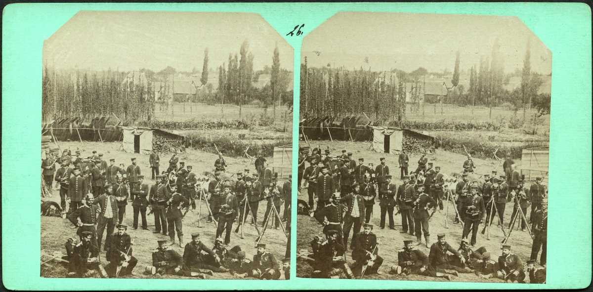 Stereobild med krigsmotiv. Soldater i läger.