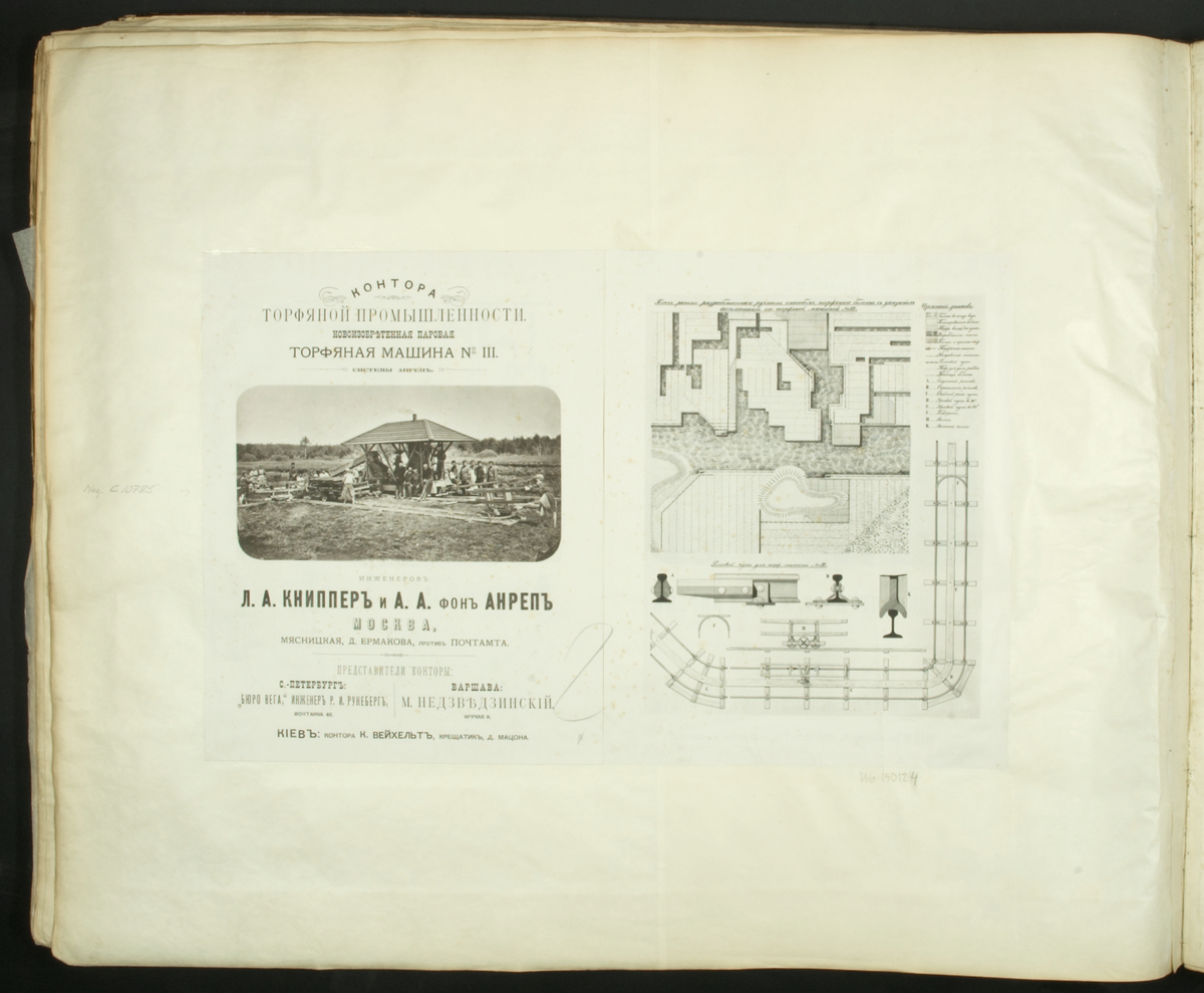 Två tryckta sidor på ryska, ur boken med ritningar mm 1868-1887, av den svenske torvmaskinkonstruktören Aleph Anrep.