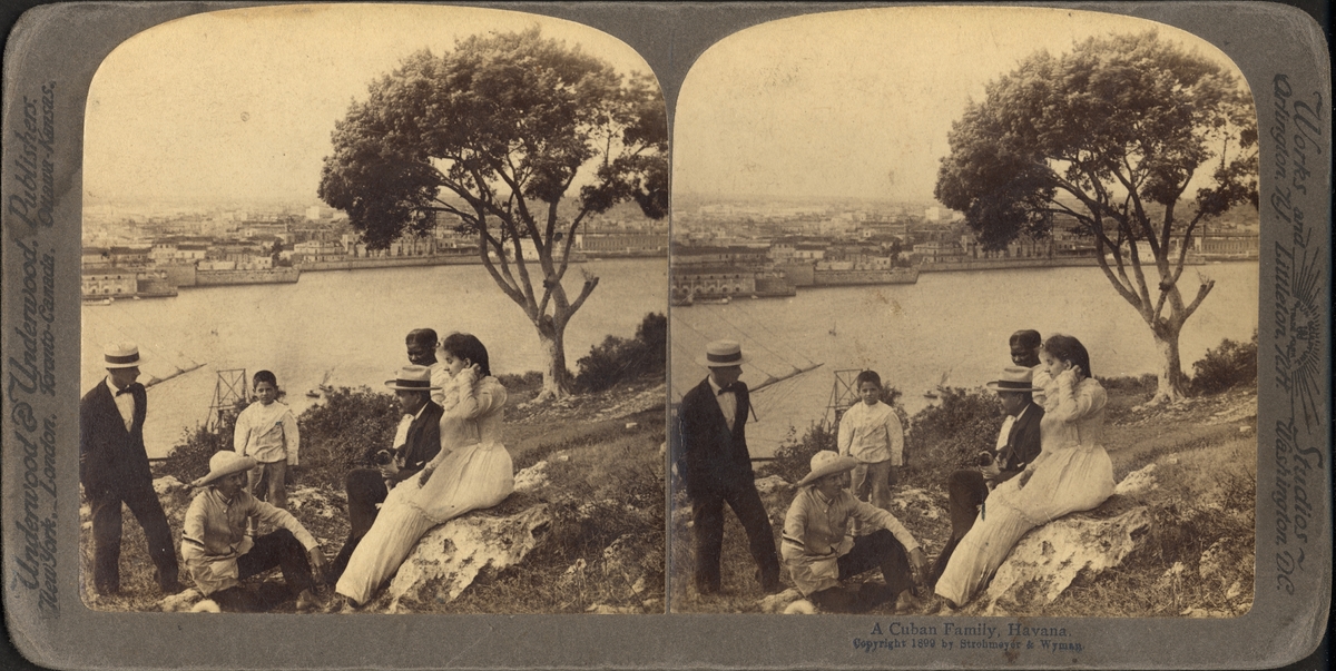 Stereobild av en familj på kulle bredvid hamnen i Havanna.