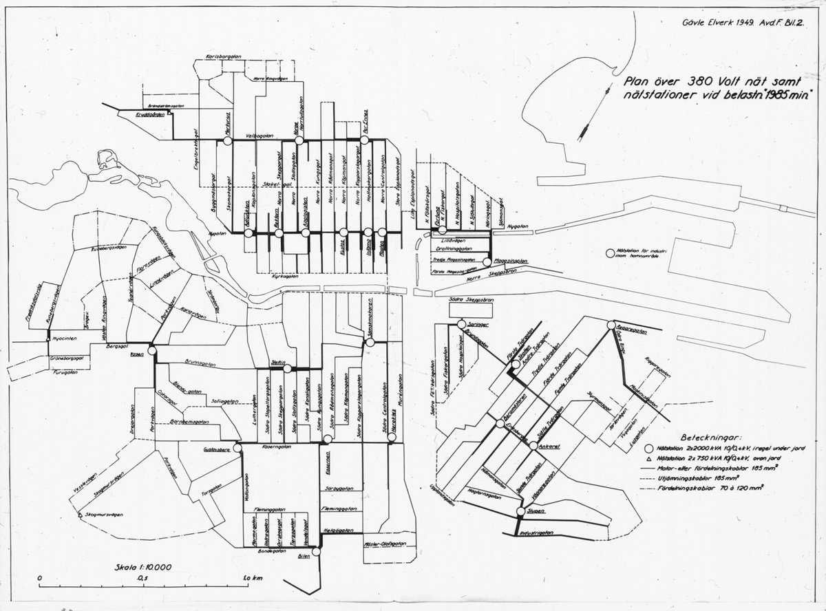 Ljusbild, plan över nät och nätstationer, Gävle elverk 1949.