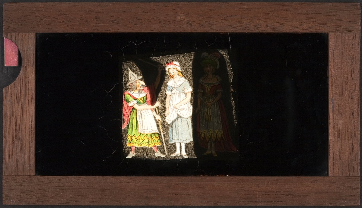 Ljusbild för laterna magica med sagomotiv av häxa och vacker flicka.