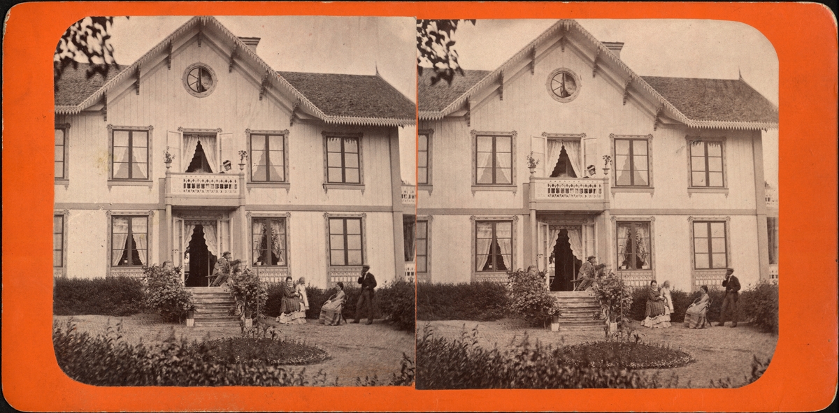 Stereobild på och invid veranda, i trädgården, till större hus.
