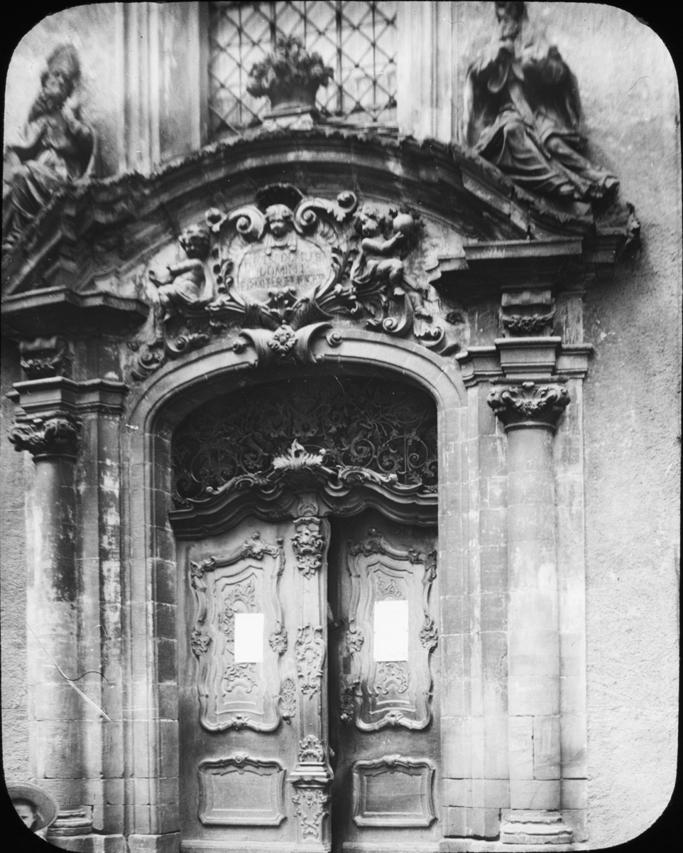 Skioptikonbild med motiv av port till okänd byggnad i Amberg.