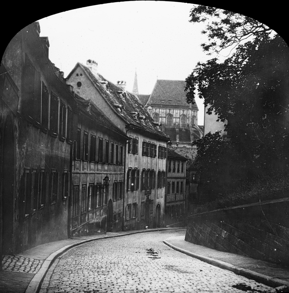 Skioptikonbild med motiv från Bamberg. I bakgrunden skymtar katedralen i Bamberg.