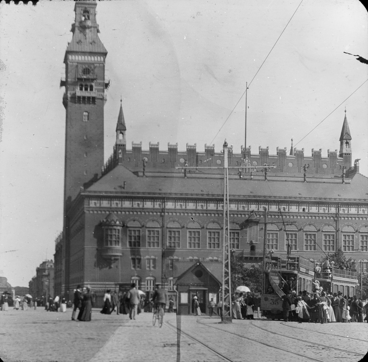 Skioptikonbild med motiv v Rådhuset och Rådhusplatsen i Köpenhamn.