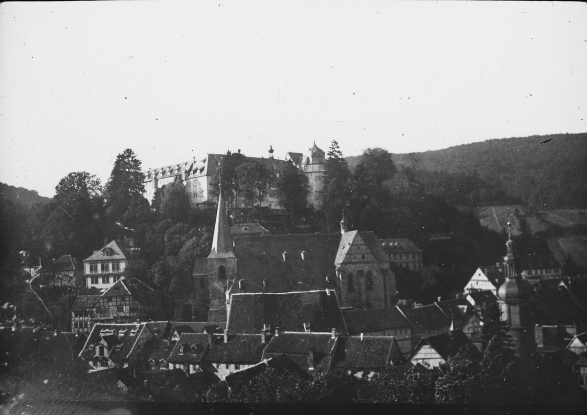 Skioptikonbild med motiv av vy över Stolberg med Schloss Stolberg på höjden.