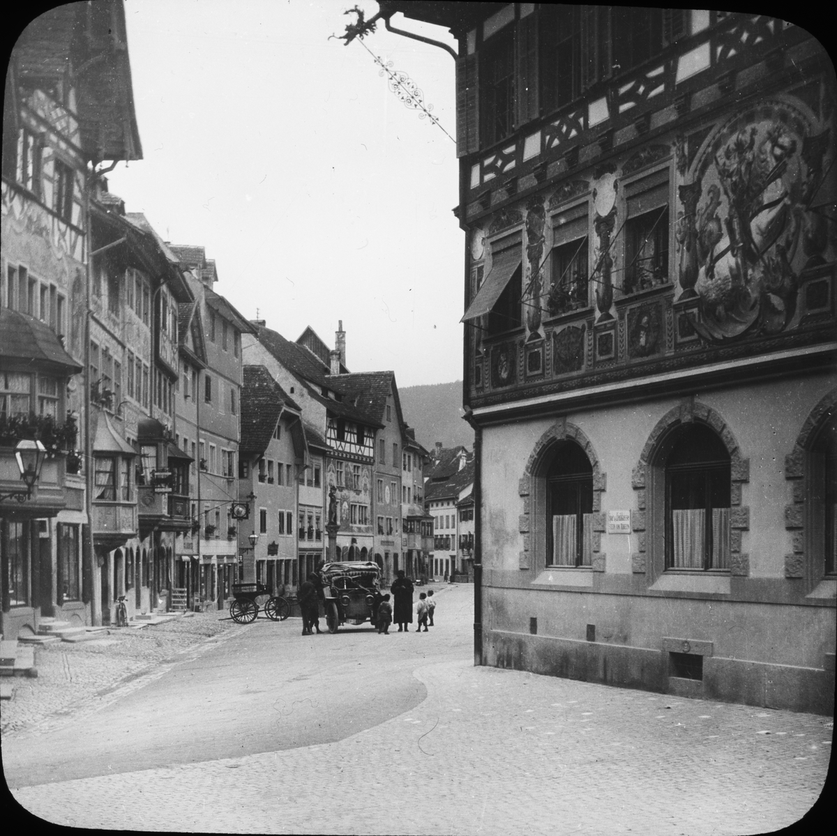 Skioptikonbild med motiv av automobil på Rathausplatz i Stein am Rhen.