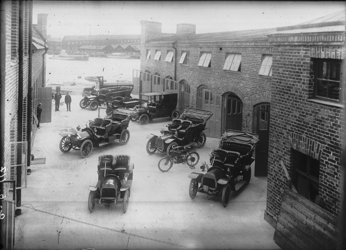 Uppställda bilar utanför Gustav Ericssons Automobilfabrik.