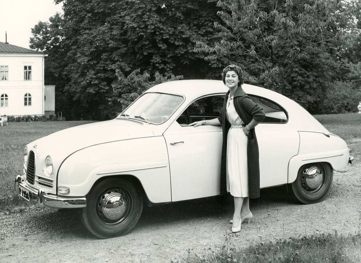 Kvinna poserar framför Saab- 93, för fyra passargerare.