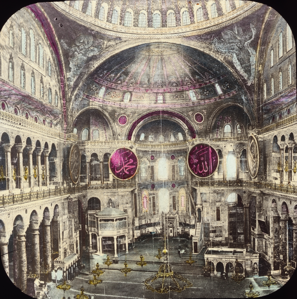 Kolorerad skioptikonbild med motiv av Hagia Sofia (interiör), Konstantinopel, Turkiet..