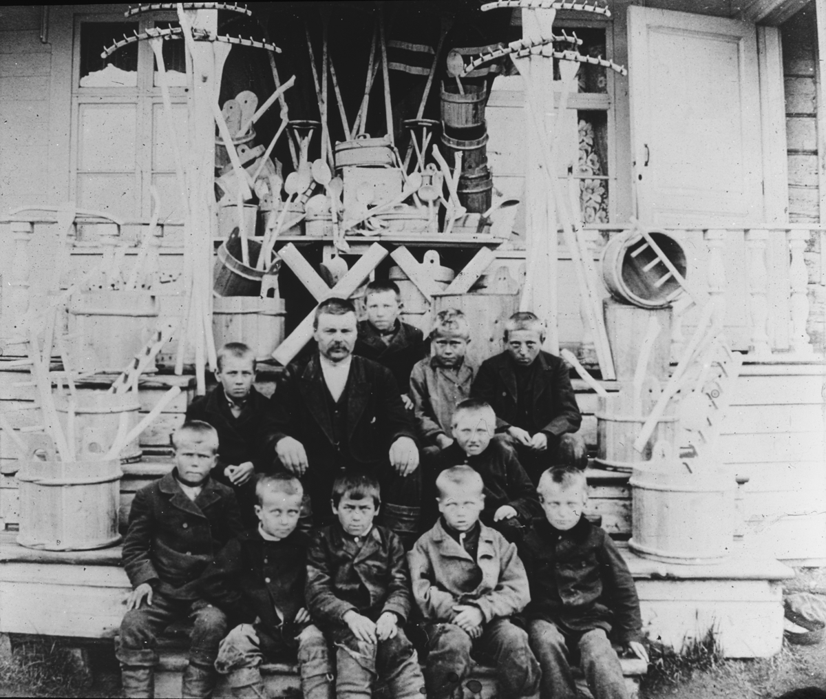 Skioptikonbild. Gruppbild, man med små pojkar. Möjligen lärare och slöjdare.