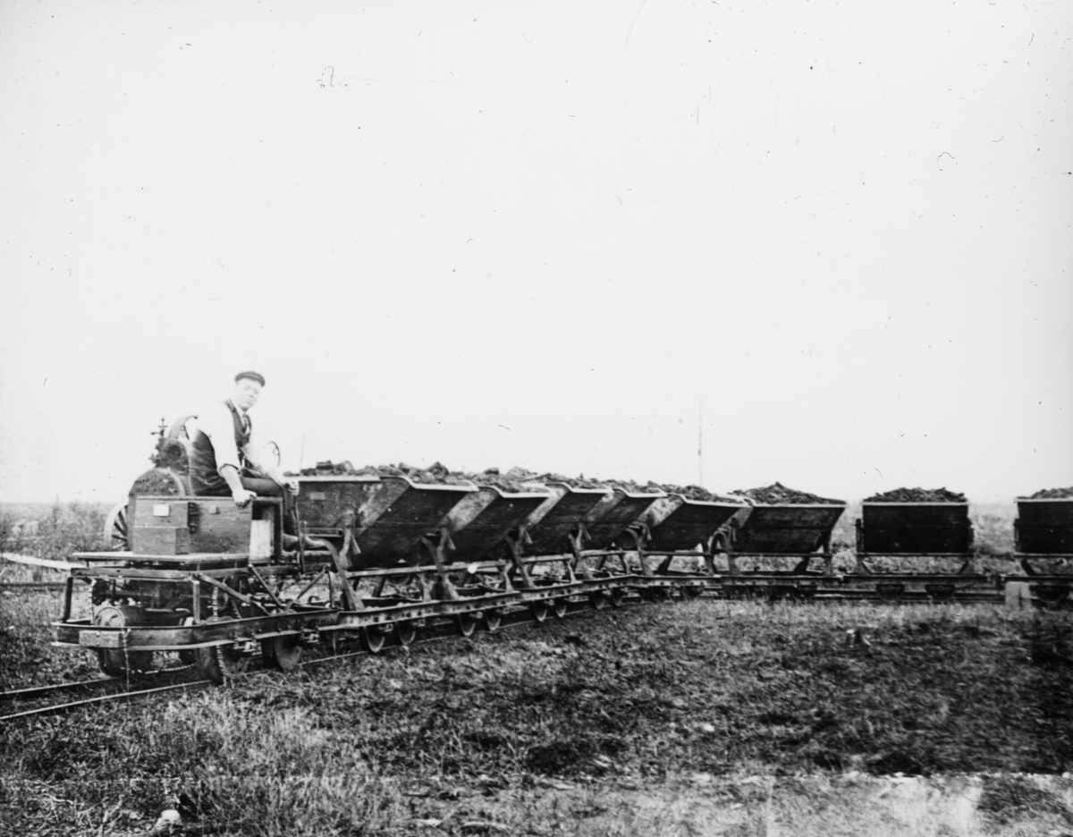 Skioptikonbild med motiv av torvtransportbana på okänd mosse/ myr.