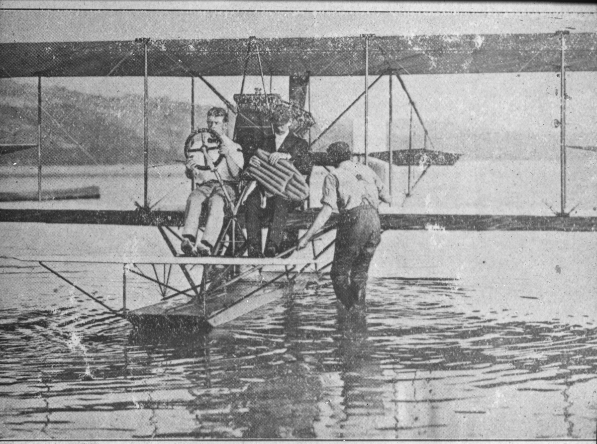 Skioptikonbild med motiv av flygmaskin på vattnet.