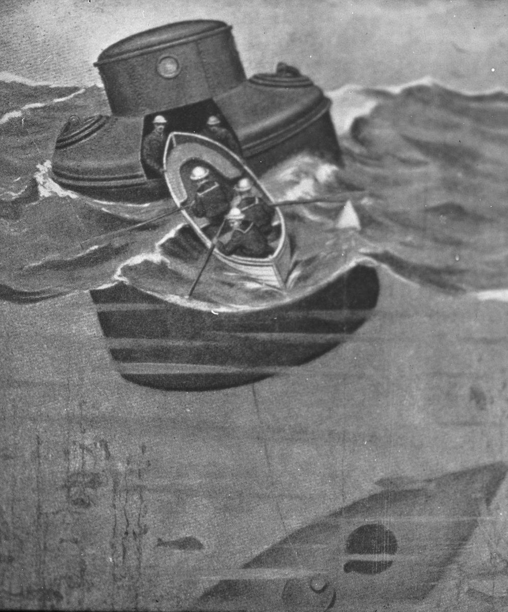 Skioptikonbild med motiv sjöfarkost samt roddbåt.