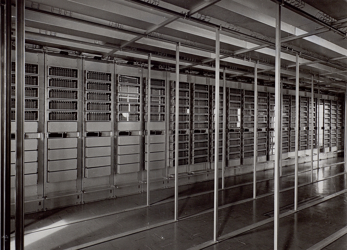 Förmedlingstation A205 i Malmö 1964. Innerhåller 1250 stativ med sammanlagt 4000 väljare och betjänar 3500 ledningar.