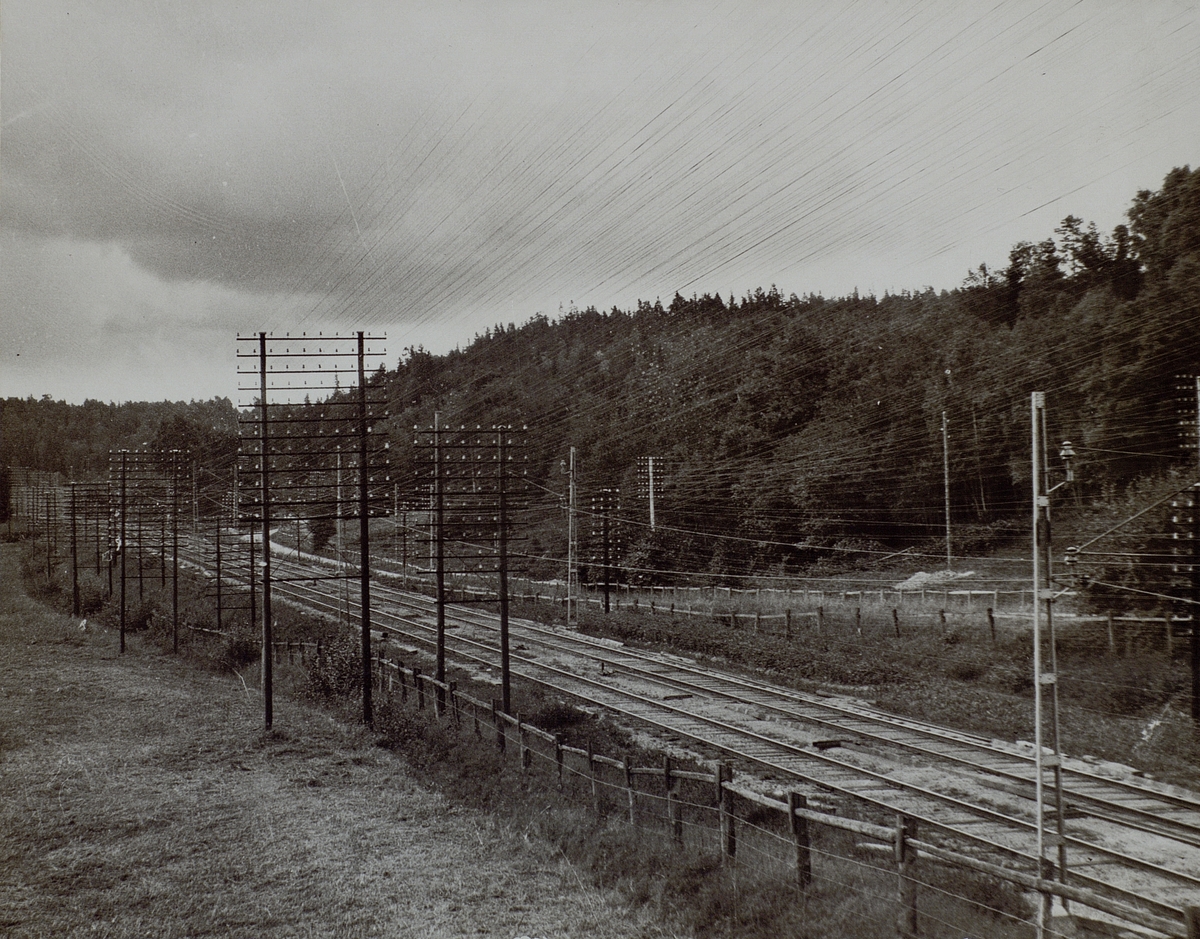Dubbel stolplinje längs Statens Järnvägar söderut från Stockholm till Södertälje.