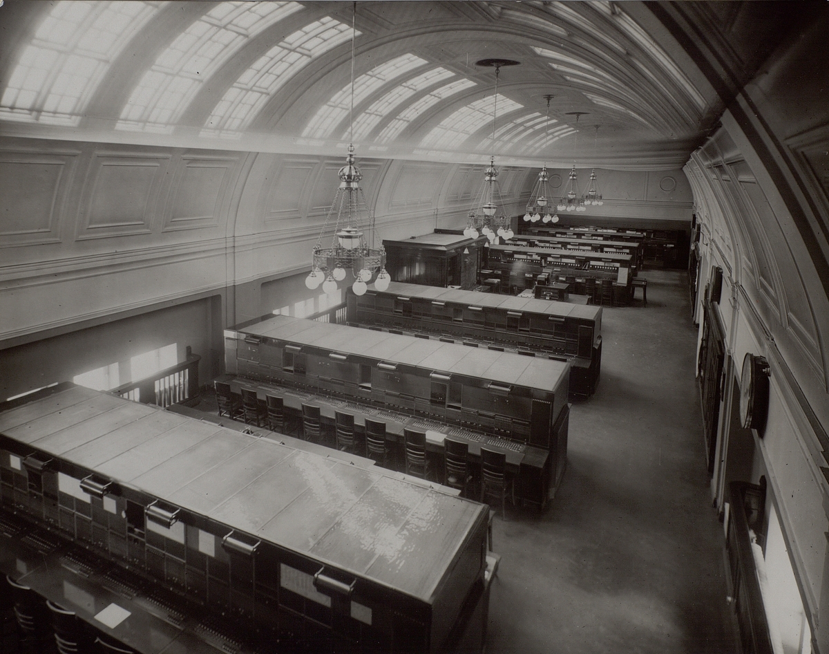 Kvarteret Jeriko. Telefonsalen för riksexpedition. Bilden tagen 1930, endast rikstelefonbyrån kvarstod ännu i oförändrat skick.